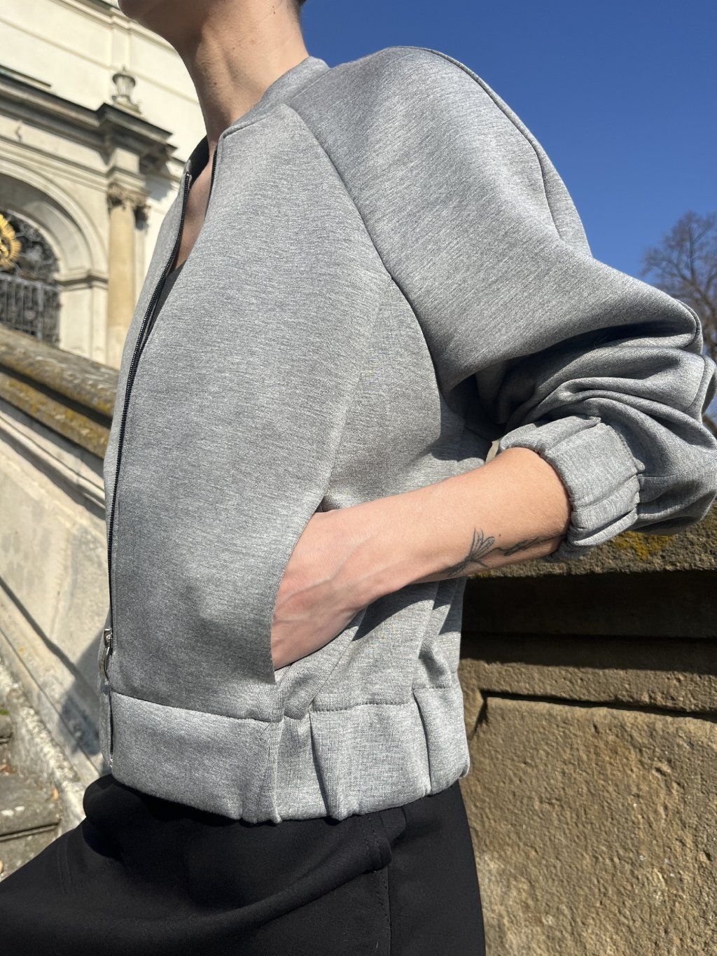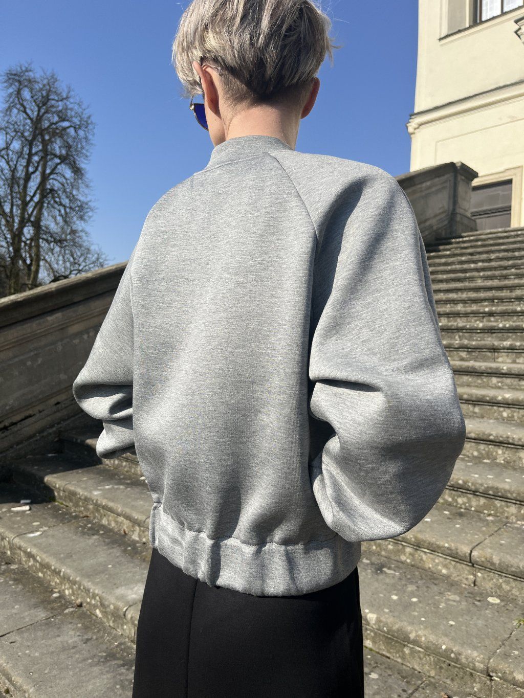 Bomberka má lehce oversize střih, který působí uvolněně a přirozeně, a přitom si zachovává ženskost. Mírně kratší délka není náhoda – krásně navazuje na naše sukně, ladí s kalhotami a přirozeně doplňuje i šaty. Všechno do sebe zapadá tak, aby ses cítila sama sebou.