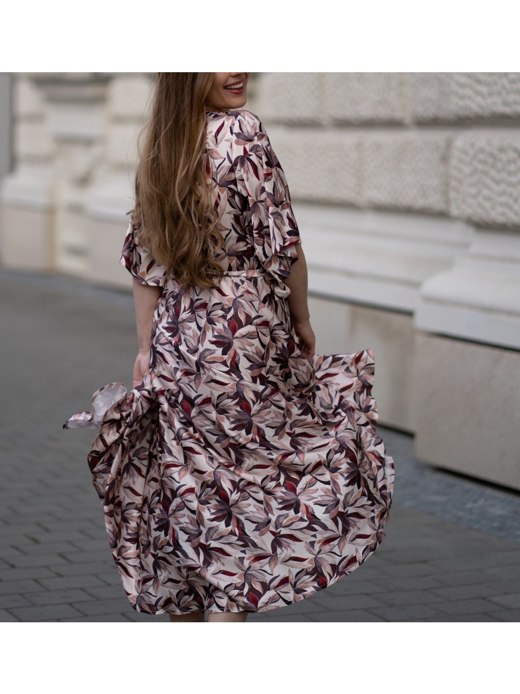Vzdušné, elegantní a mimořádně variabilní. Tyto zavinovací šaty z hebkého umělého hedvábí se zlatým detailem si zamilujete pro jejich ženský střih a praktičnost. Přední část je jemně zkrácená pro lehký pohyb i zajímavou siluetu, zatímco širší rukávy sahající k loktům dodávají šatům noblesu a pohodlí v jednom.